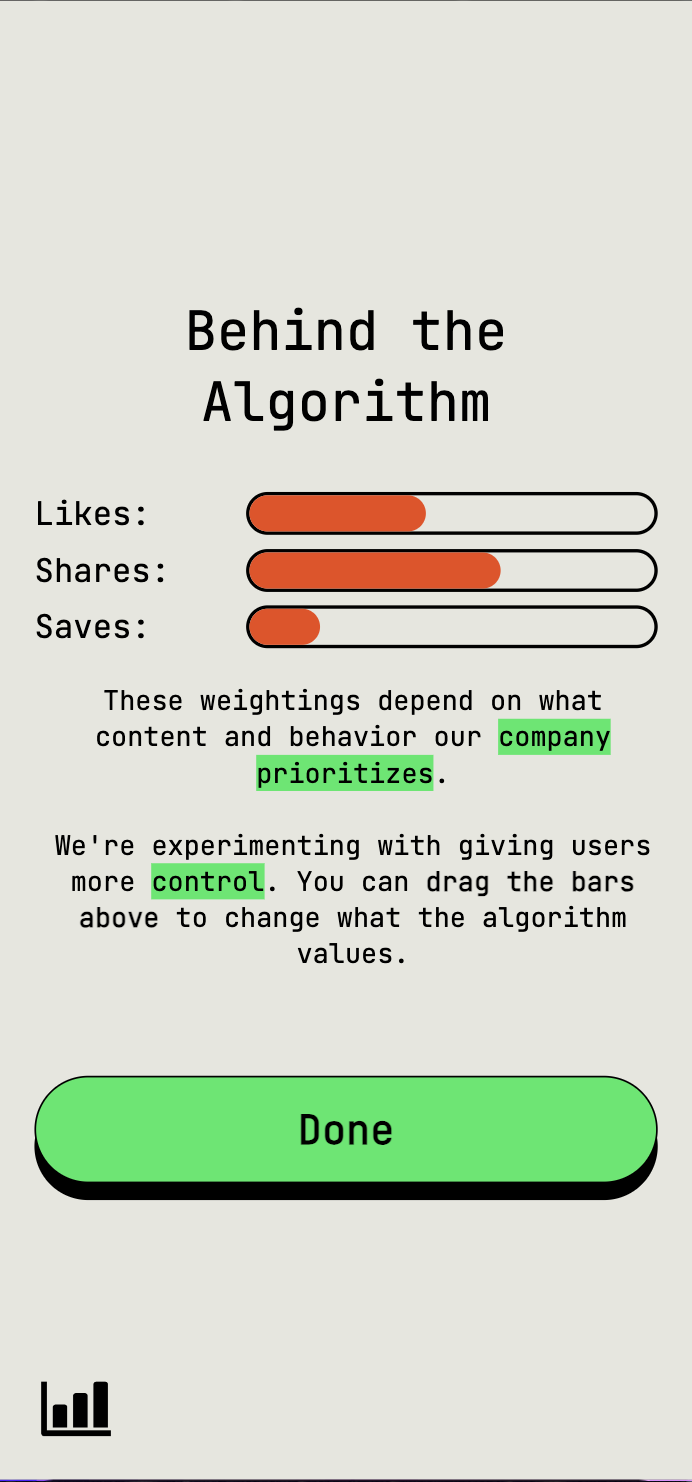 The Algorithm aims to demystify recommender systems for the broader public. It is a part of a larger mission to leverage creative coding and web-based experiences to build public literacy of emerging technologies.